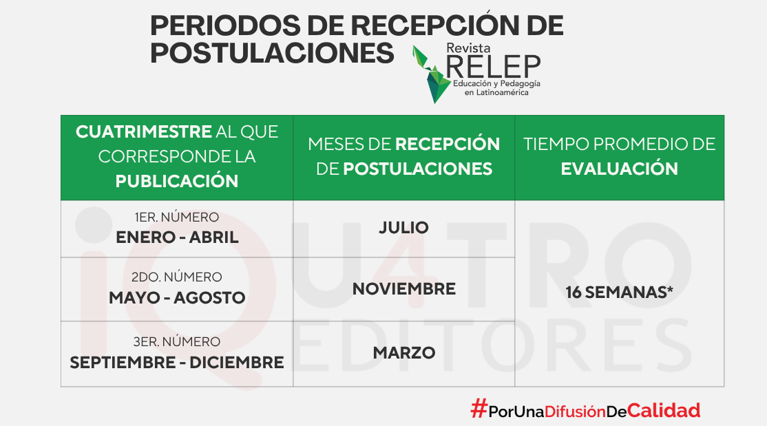 Una vez recibida la postulación en la página de la Revista RELEP. Educación y pedagogía en Latinoamérica, el Comité Editorial de iQ4 Editores realizará la revisión PRELIMINAR, cuidando que el trabajo cumpla con los criterios de contenido, área temática, originalidad, citación, extensión y plantilla, solicitados por la revista en su convocatoria. En caso de tener observaciones, los autores recibirán los comentarios como una DISCUSIÓN PREVIA A LA REVISIÓN y contarán con UNA semana para atender las observaciones en su totalidad y enviarlas a través de una DISCUSIÓN PREVIA A LA REVISIÓN atendiendo la fecha límite otorgada por la editorial. Una vez que el trabajo cumpla con todos los lineamientos, la editorial confirmará la RECEPCIÓN DE LA POSTULACIÓN para iniciar su proceso de arbitraje a doble ciego. Una vez recibida esta confirmación, los autores contarán con 7 días naturales para cubrir el costo de inversión de 4,000 MXN / 215 (USD) por PRODUCCIÓN EDITORIAL. El comprobante de pago deberá cargarse como una discusión previa a la revisión dentro de su envío creado en la plataforma de la Revista RELEP. Educación y pedagogía en Latinoamérica. Se deberá generar una segunda discusión titulada CONFIRMACIÓN DE METADATOS donde colocará el orden de autores, instituciones de afiliación y códigos ORCID de cada uno de los colaboradores del trabajo.